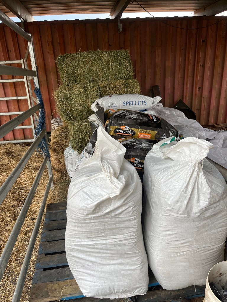 Small feeds of 1/2 & 1/2 oaten/wheaten & lucerne chaff are a great base for essential minerals/vitamins to ensure a healthy diet. Extra to this is dependent on each individual and the requirements on them. Slow feeders/nets are great ways to ensure roughage is available at all times and can be placed in various locations to encourage movement. Having them away from the water trough is a great way to ensure movement.