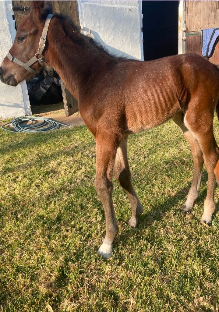 Haliae was born with some minor limb deviations. His near front is bowing out at the knee and turning in at the fetlock. He is also over at both knees. He was windswept behind left to right, but as he strengthened this came right within a few days.