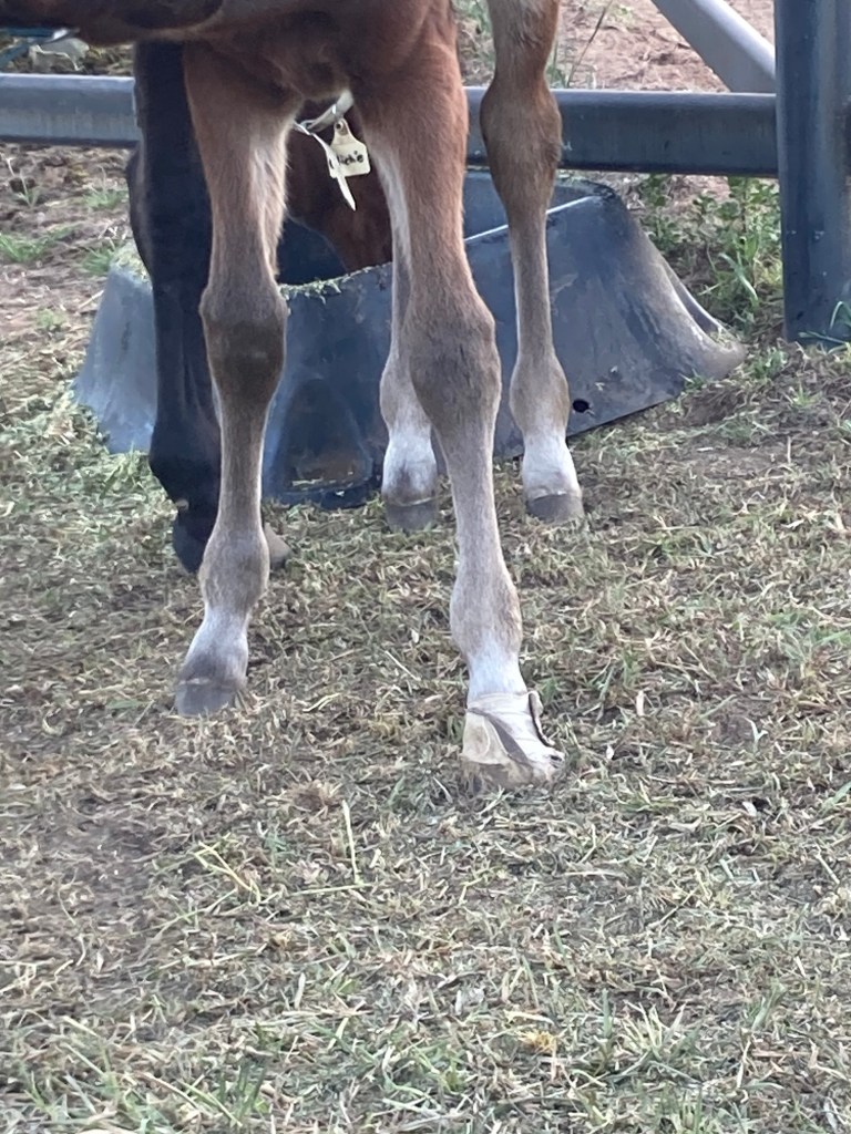 Haliae has had a lateral extension taped on (he’s too young for it to be safely glued) this will support his knee and encourage his fetlock to come back out.